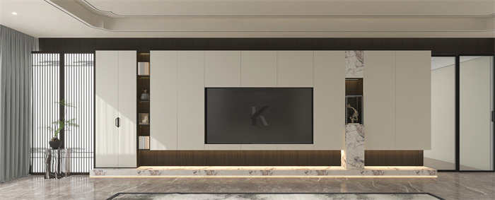 電視柜以環保水性漆“雅杏”淺色為主,構筑素雅基調,水墨石紋、古樸木紋、格柵屏風加持,濃濃的東方韻味。