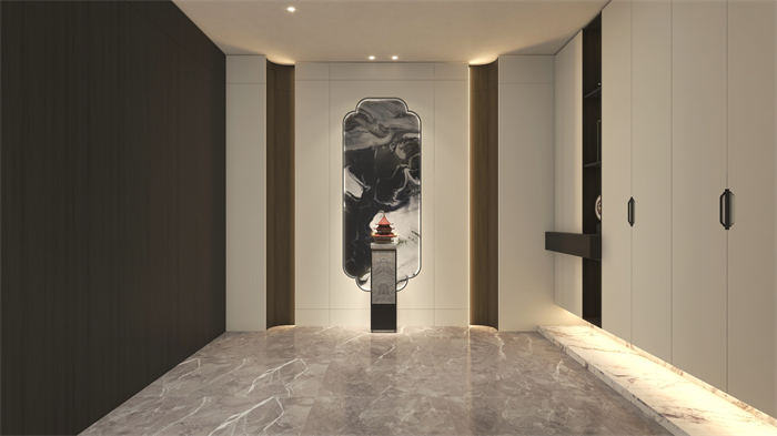 門廳:新中式元素“奢石”地臺作為點綴,開啟新國潮視覺盛宴。護墻板燈帶勾勒出簡約的宮燈形狀,與右邊柜門的燈籠造型拉手遙相呼應。對稱式圓弧轉角,將護墻板與玄關柜柔美連接,渾然一體,自然天成。