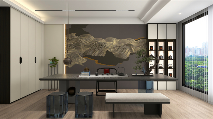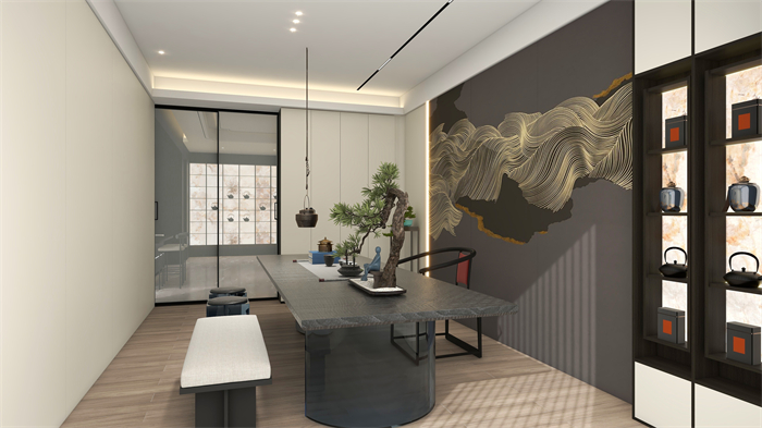 茶室:打破傳統對稱均衡,一側一門到頂封閉柜,一側半開放式設計,既彰顯東方韻味,又為視覺做減法,簡單大雅。玻璃的通透與木紋的肌理相互交融,剛柔相濟,精致而高級。