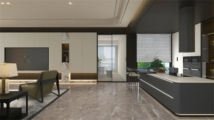 餐廳:餐廚一體化設計,縮短用餐動線,增加交互性,更符合當代人的需求。島臺、吧臺與餐桌融為一體省空間,圓弧轉角營造東方人居的溫潤感,鋪陳優雅、低調、現代、隨性的餐廳氛圍。