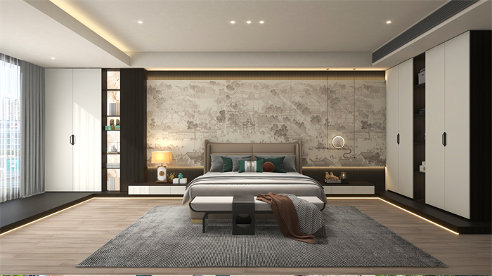 主臥:衣柜及床頭柜采用對稱式設計,與圓形燈裝飾掛件形成了方與圓的空間禮序,多處鏤空設計展示朦朧透視的詩意想象。床尾凳實用與顏值兼備,要穿的衣服可以放在這里,還可充當早餐椅,就著陽光,吃著早餐。深色U型地臺將淺色柜體抬起,收納與顏值兼備,3D錯落增加懸浮感,搭配古風市井畫,夢回千年古都。