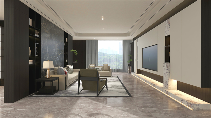 沙發背景啞黑鋁板柜對稱設計,與深色“沉香”完美契合,遇見東方禮序之美,木紋、石紋、鋁板,傳統與現代材質碰撞彰顯層次感,搭配國風家品,更顯東方意境。