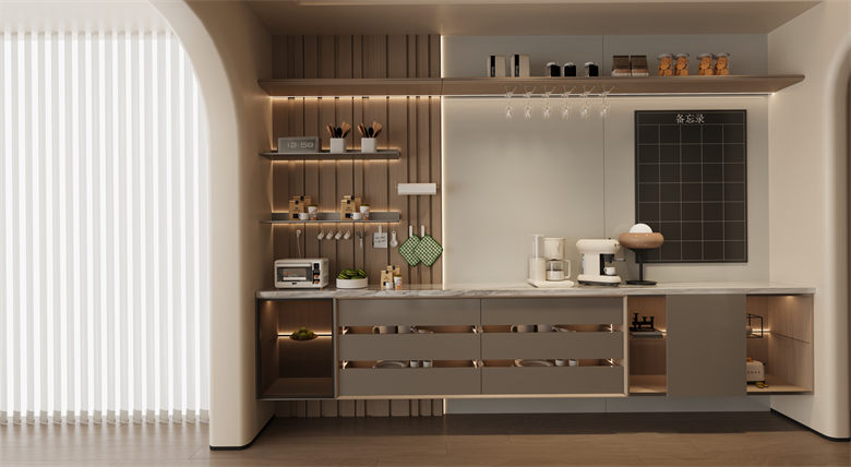布局設(shè)計上,羅亞全屋定制更是打破了家居就該有固定模樣的陳規(guī)。餐廳與陽臺不再是割裂的存在,而是被打造成聯(lián)動的“咖啡區(qū) + 品酒區(qū)”;早晨在這里沖一杯手沖,用咖啡香喚醒元氣;夜晚調(diào)一杯利口酒,讓微醺消解疲憊。