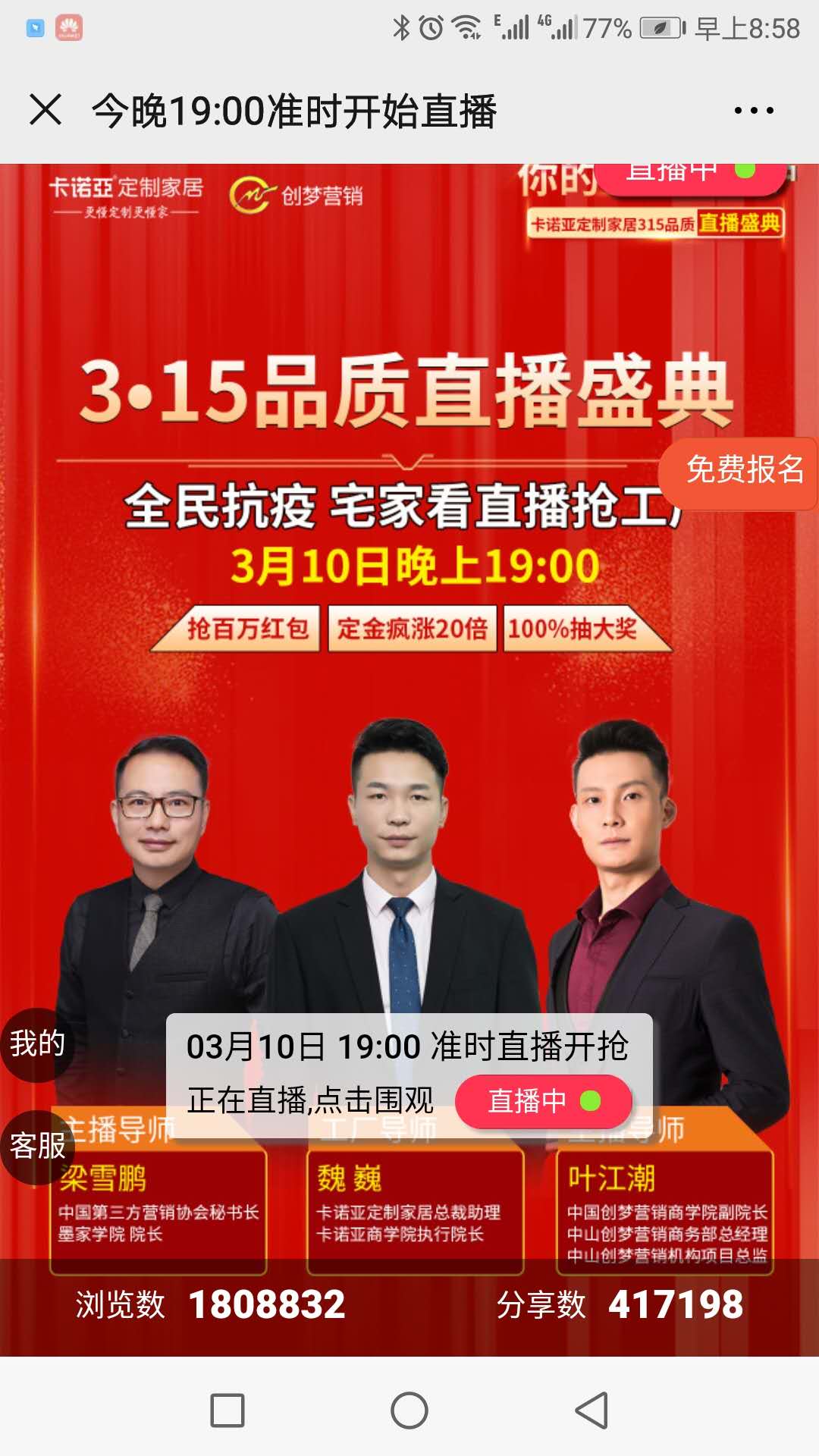 早在2019年,中國定制家居頭部品牌卡諾亞,便已意識到線上渠道的重要性,開展了全國微信搶購惠系列活動,隨著新冠疫情的蔓延,消費者閉門不出,如何實現全國門店的逆勢破局,是擺在卡諾亞面前的一個緊急課題,也是體現企業責任與擔當的時候。2月27日-3月10日,卡諾亞攜手中國知名的第三方策劃機構“創夢營銷”,借助美戶通裂變鎖客直播神器,推出“你的家,我來守護”卡諾亞定制家居315品質直播盛典,給全國消費者帶來一場與眾不同的品質服務承諾,以期用更健康環保的產品,更優惠的全屋空間定制套餐,更優質的一站式服務,凝心聚力,共克時艱,回饋社會,為消費者品質筑家、服務送到家,保障每一個家庭的健康,為行業提供開創性裂變鎖客直播新模式。