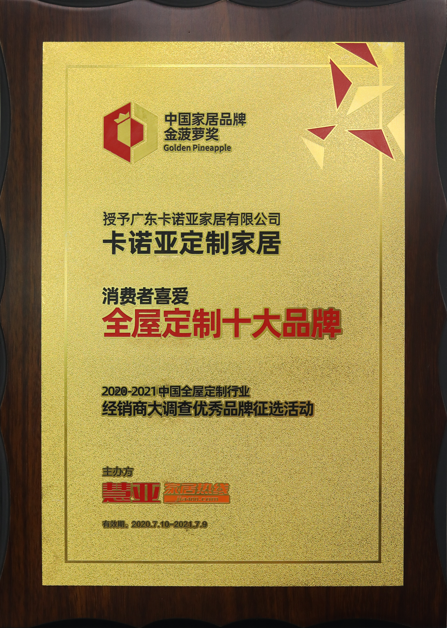 7月10日,2020第五屆中國大定制家居營銷發展論壇暨家居品牌金菠蘿獎盛典在中國建博會(廣州)舉行。卡諾亞副總經理兼營銷總經理賴永精,作為發言嘉賓出席會議,并分享“提升數字化能力,助力家居業發展”主題內容。同時,卡諾亞憑借專注定制家居19年的企業實力和品牌魅力,榮獲“中國家居品牌金菠蘿獎·消費者喜愛全屋定制十大品牌”獎項。