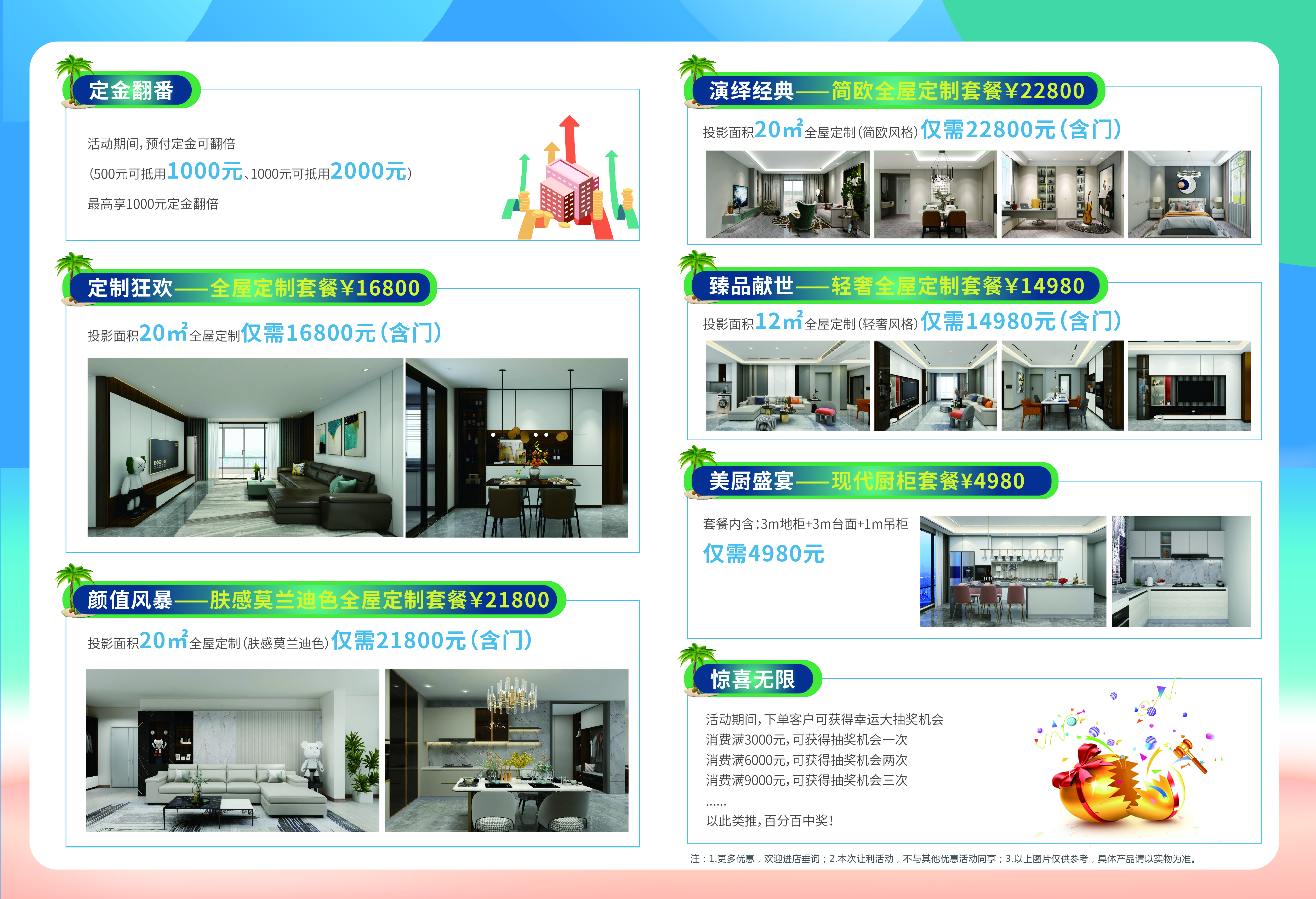 亞整裝“特惠拎包入住,夏日清涼價”大促,攜手全國中大型裝企一起發力,拿出實實在在的優惠讓利,讓顧客享受高品質整裝精品。活動期間,預付定金可實現翻倍,讓裝修省錢。
